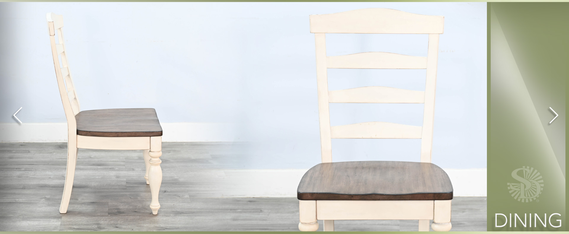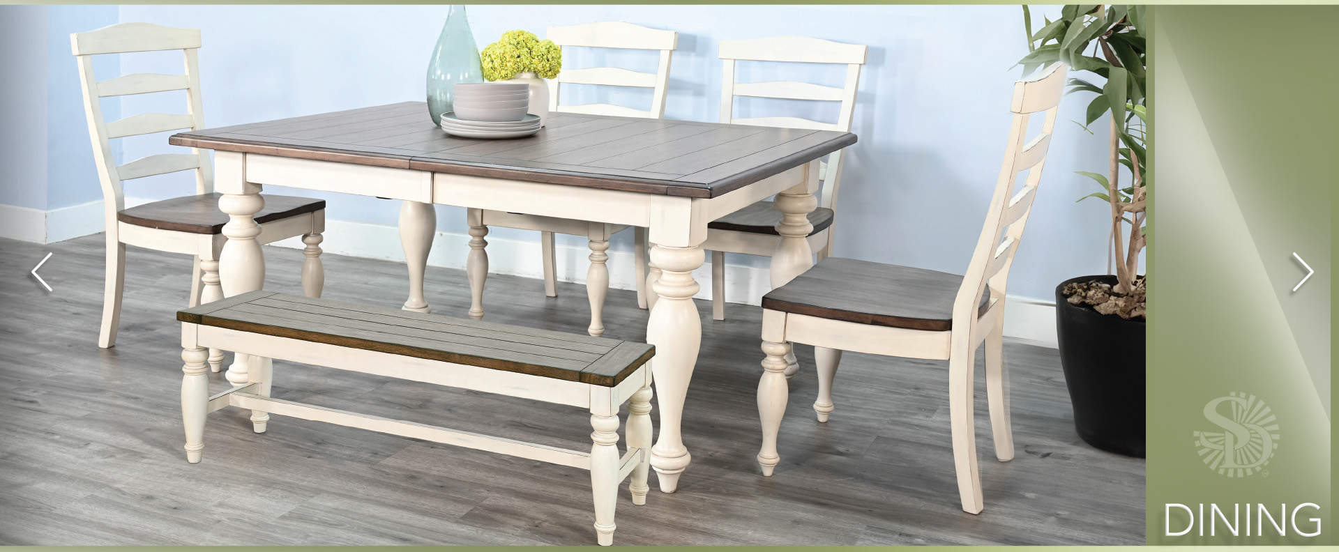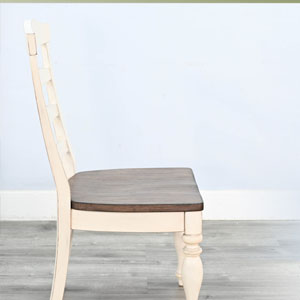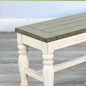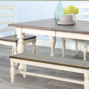 The Pasadena Dining is a complete dining set with the choice of two wood seating style chairs, a bench, and a complementary server. These pieces were designed with a soft earthy two-tone finish and constructed to last with mindi solids and veneers.