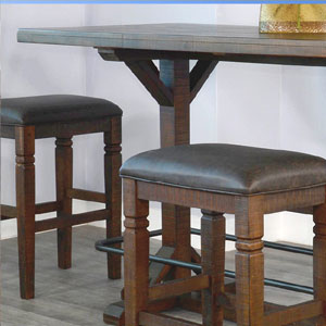 The Homestead pub table was constructed with mahogany and mindi solids and veneers. Its design suggests contemporary with industrial trades and its metal foot rail gives it a very unique look and practicality