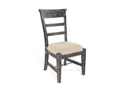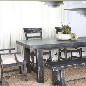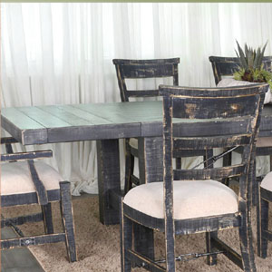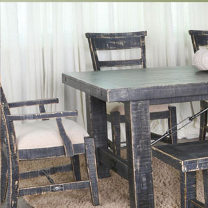 distressed mahogany solids and turnbuckle accents that add sturdiness and flow. The chairs are comfortably upholstered,
