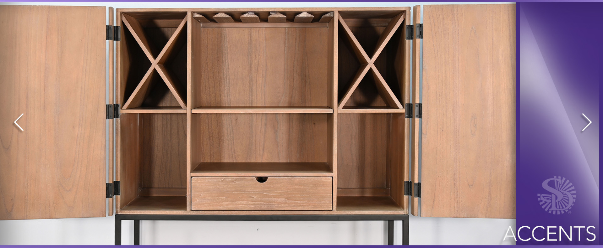 Designed for both storage and serving, the metal base supports a spacious interior with two shelves, offering ample room for your favorite bottles and bar essentials. The fully swinging doors conveniently store on the sides, providing easy access while maximizing space.