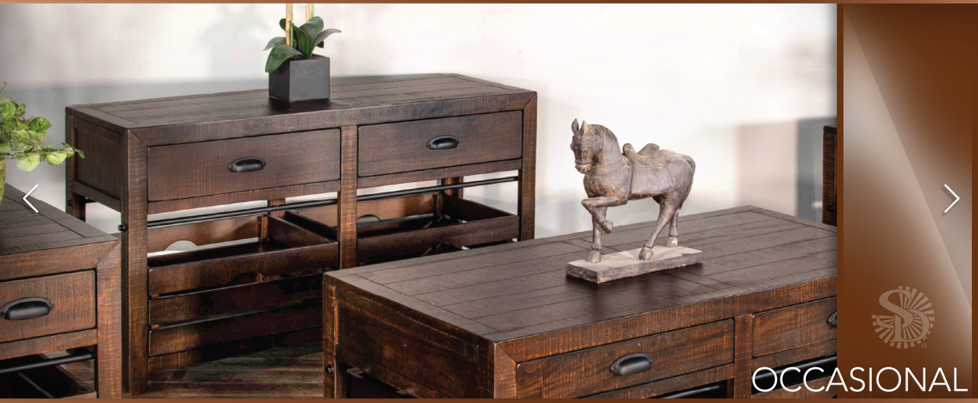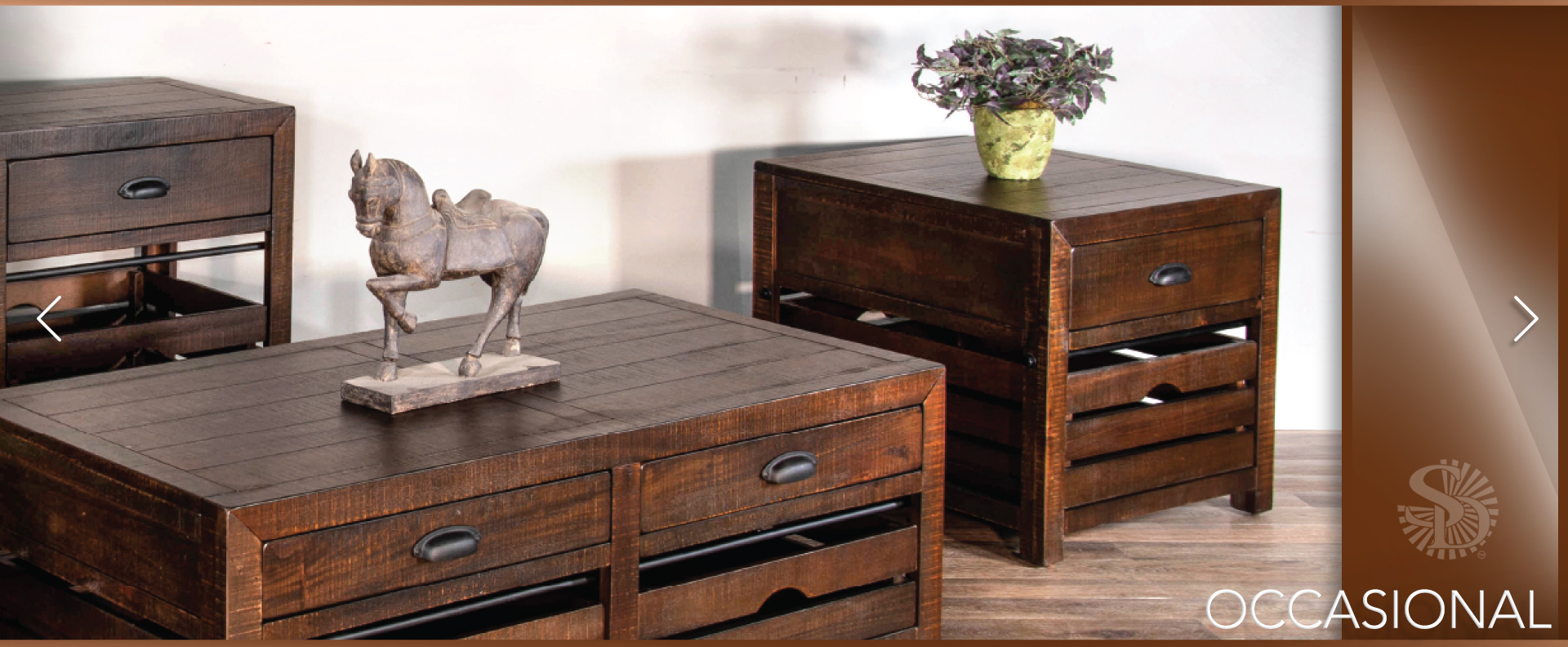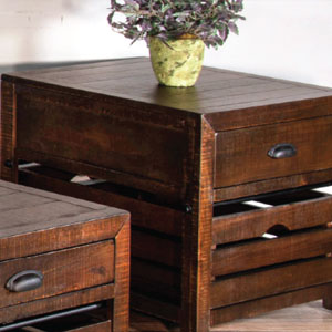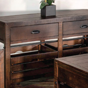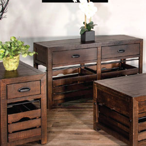 The Homestead occasional set features a beautiful rough sawn Tabacco Leaf finish. All pieces have a metal bar accent. Removable crates and large drawers offer tons of space for storage.
