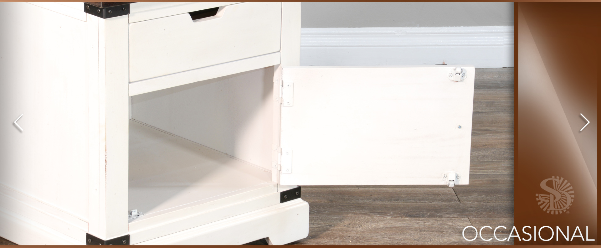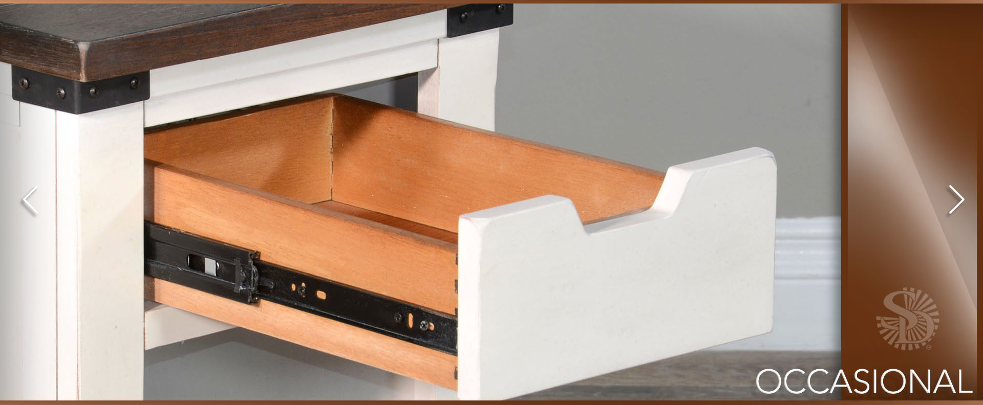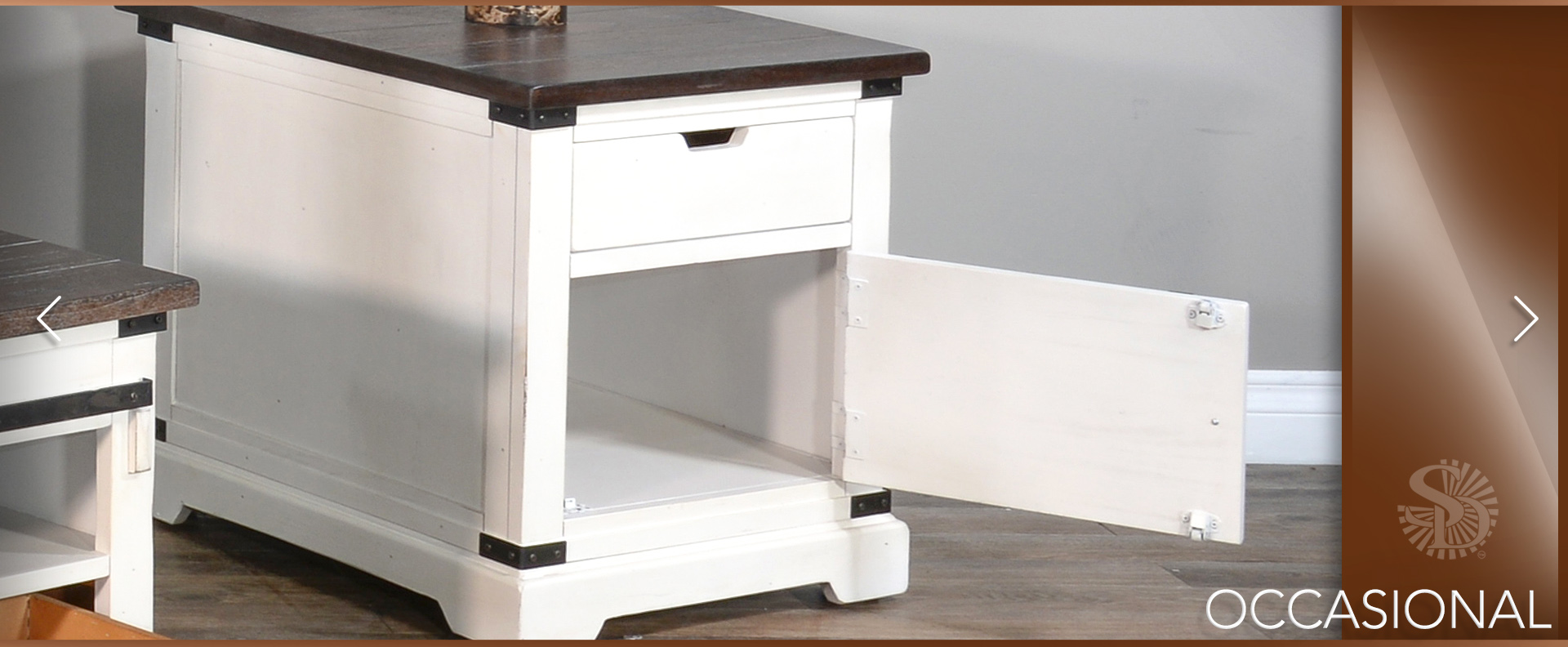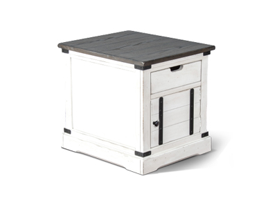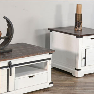 The French Country occasional table set was designed with barn door hardware. The cofee table has one functional sliding door along with hidden casters. This set pairs nicely with the barn door media console.