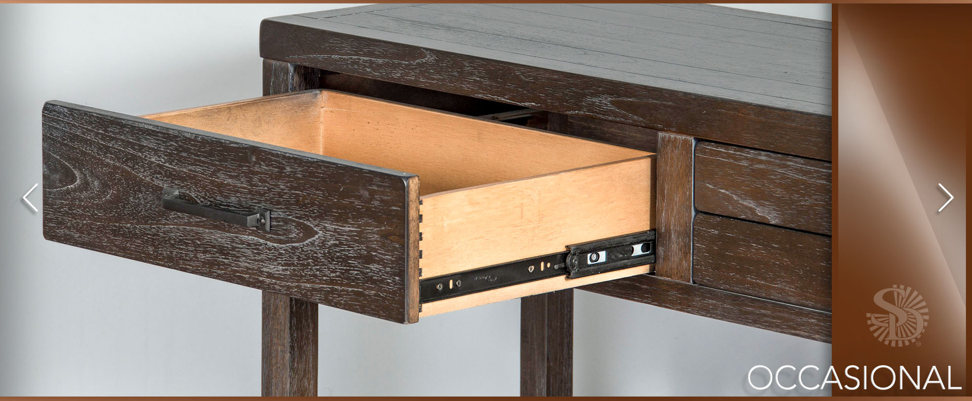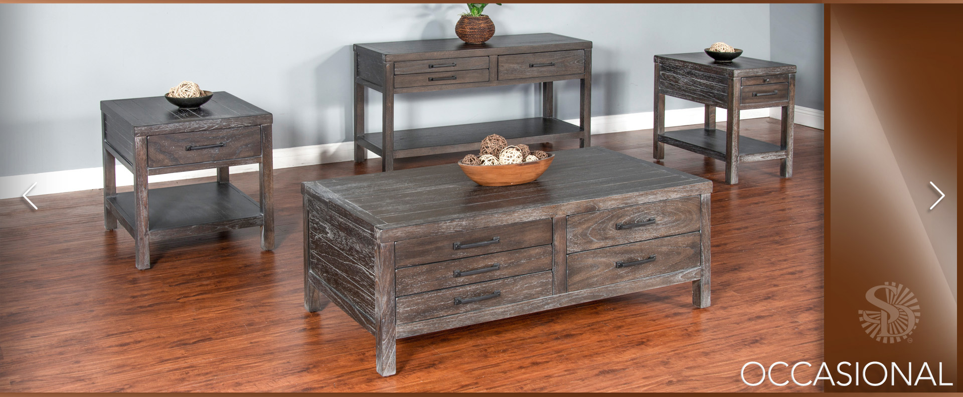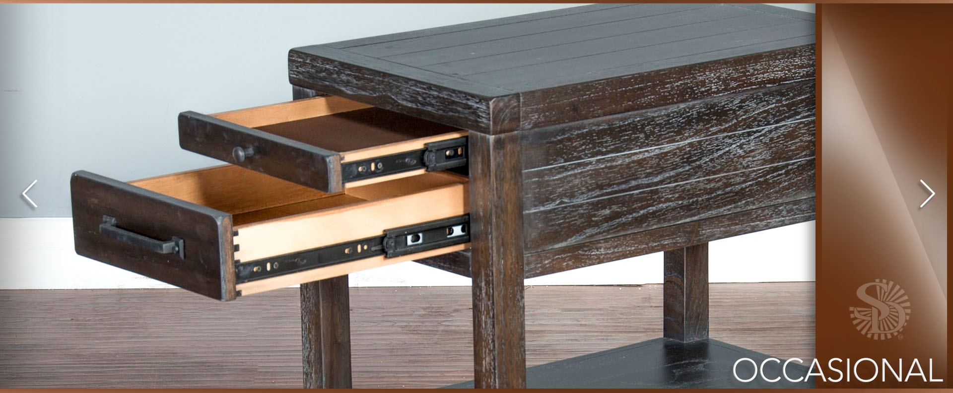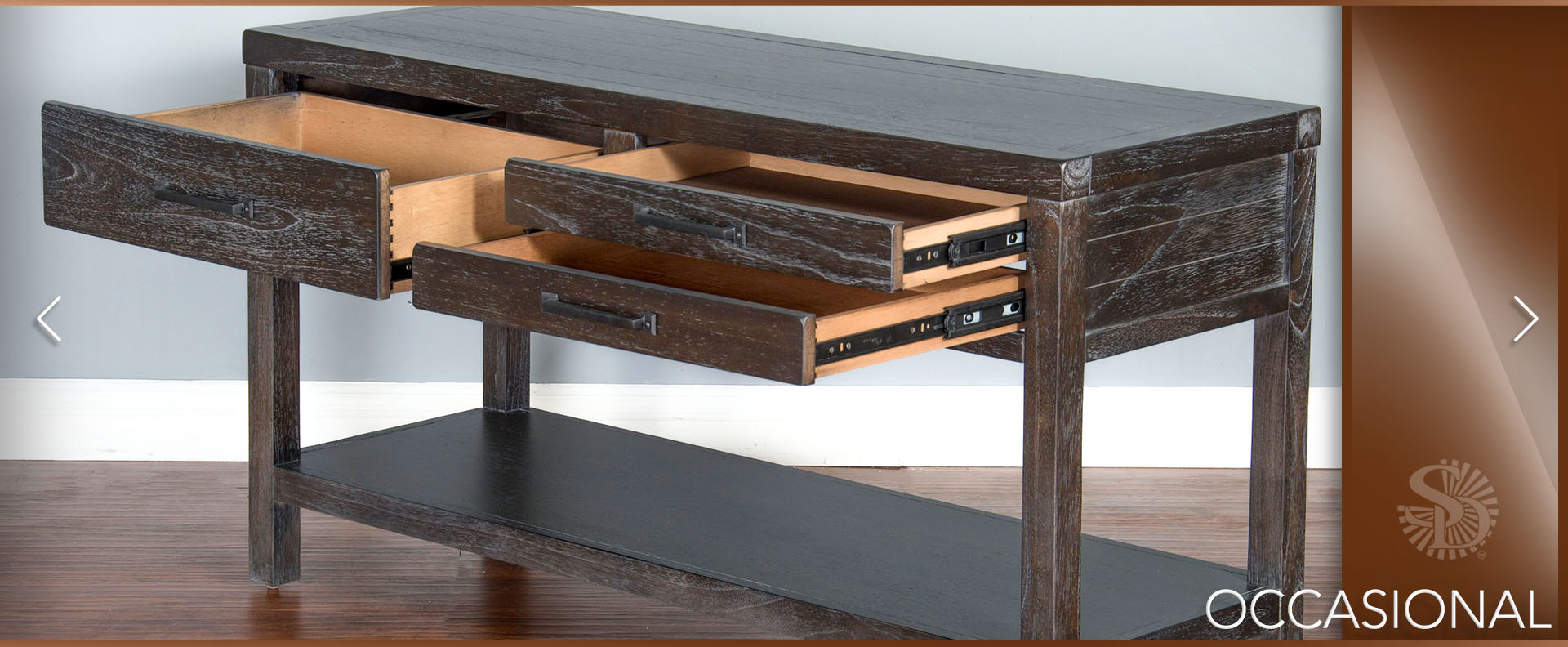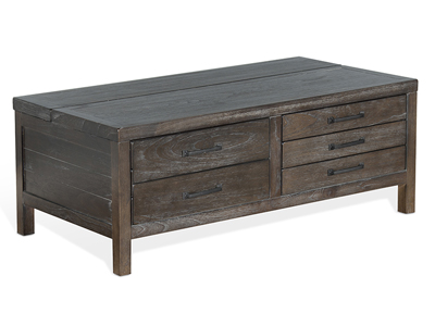 The Dundee occasional set has an attractive rustic black finish called Kettle Black. The decorative hardware almost blends in with its design. All the drawers have full extension ball bearing guides.