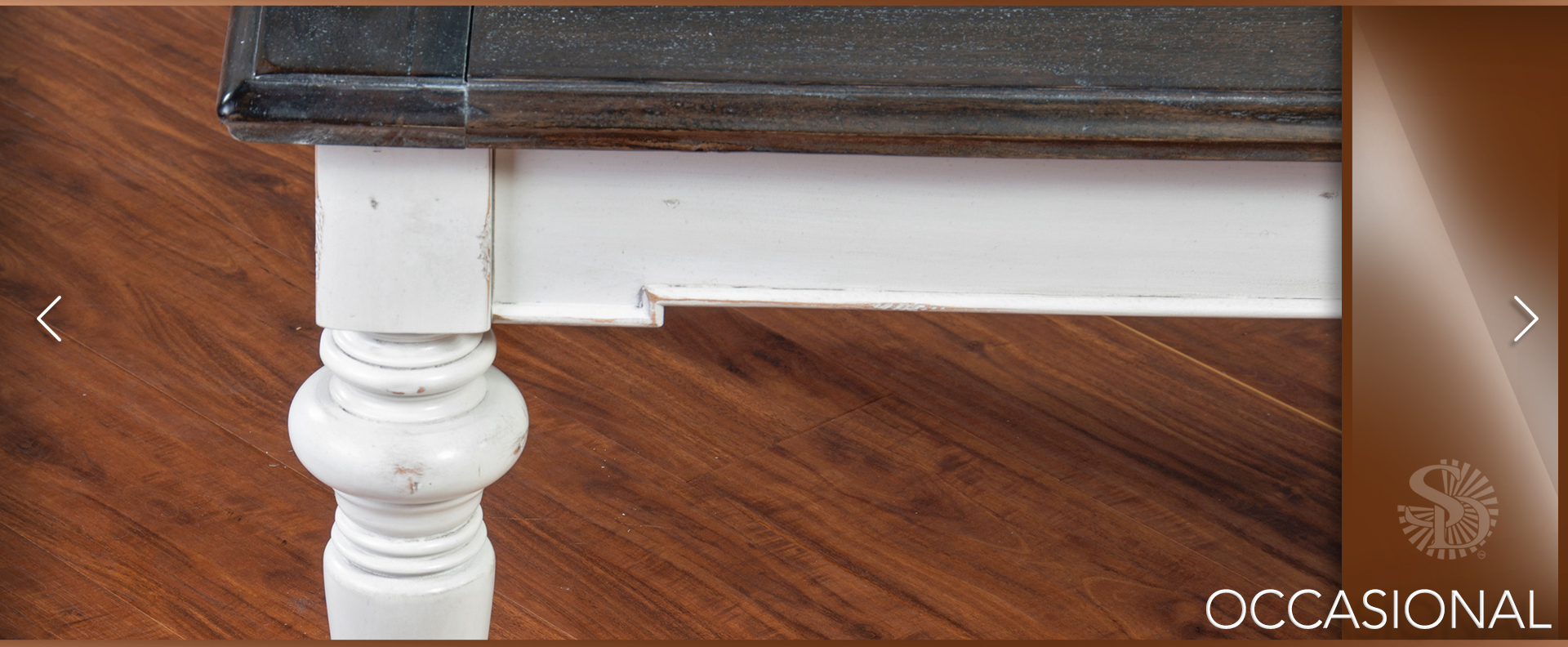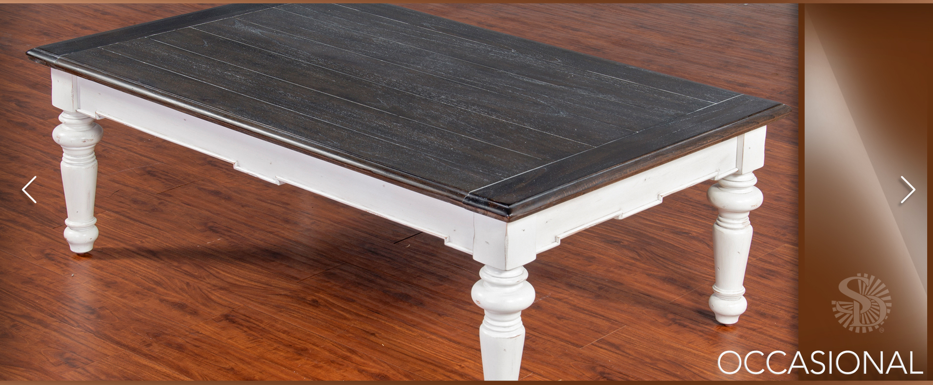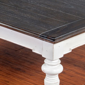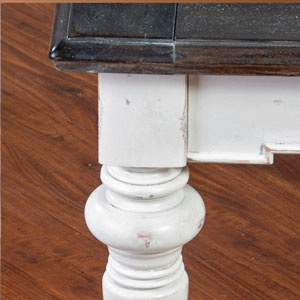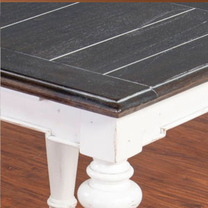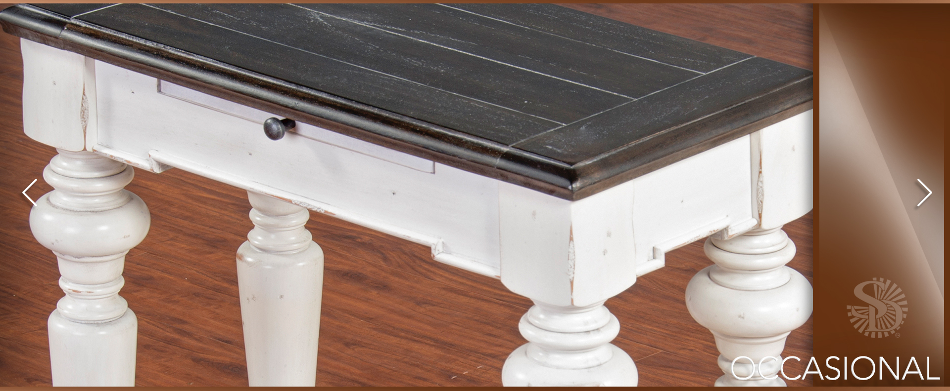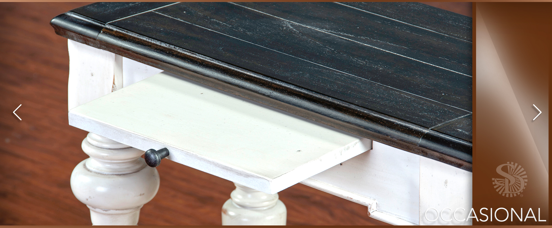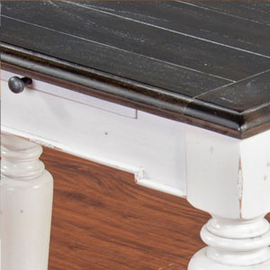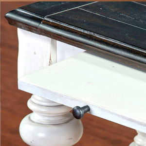 The European Cottage occasional table set was designed with plank tops, turned legs, and dovetailed drawers. The corresponding console bar table with the swivel stools will add a finishing touch to your family room.