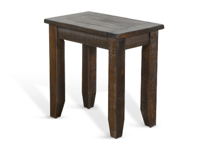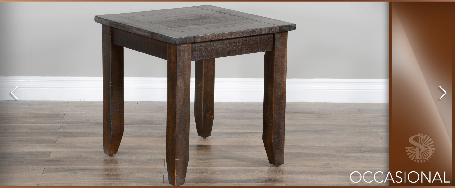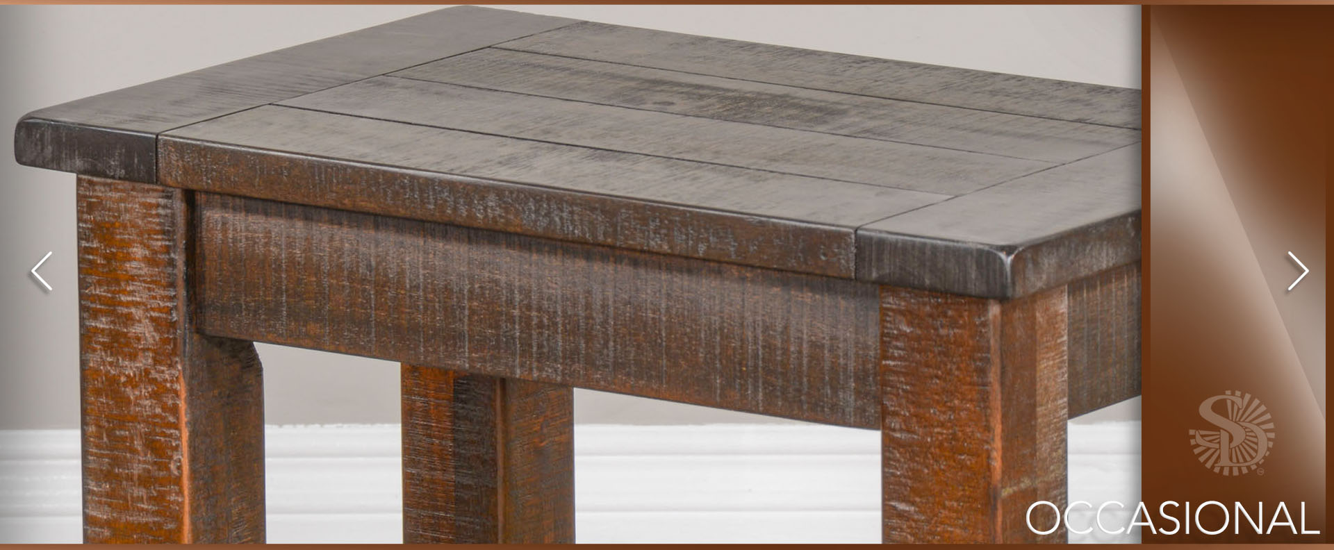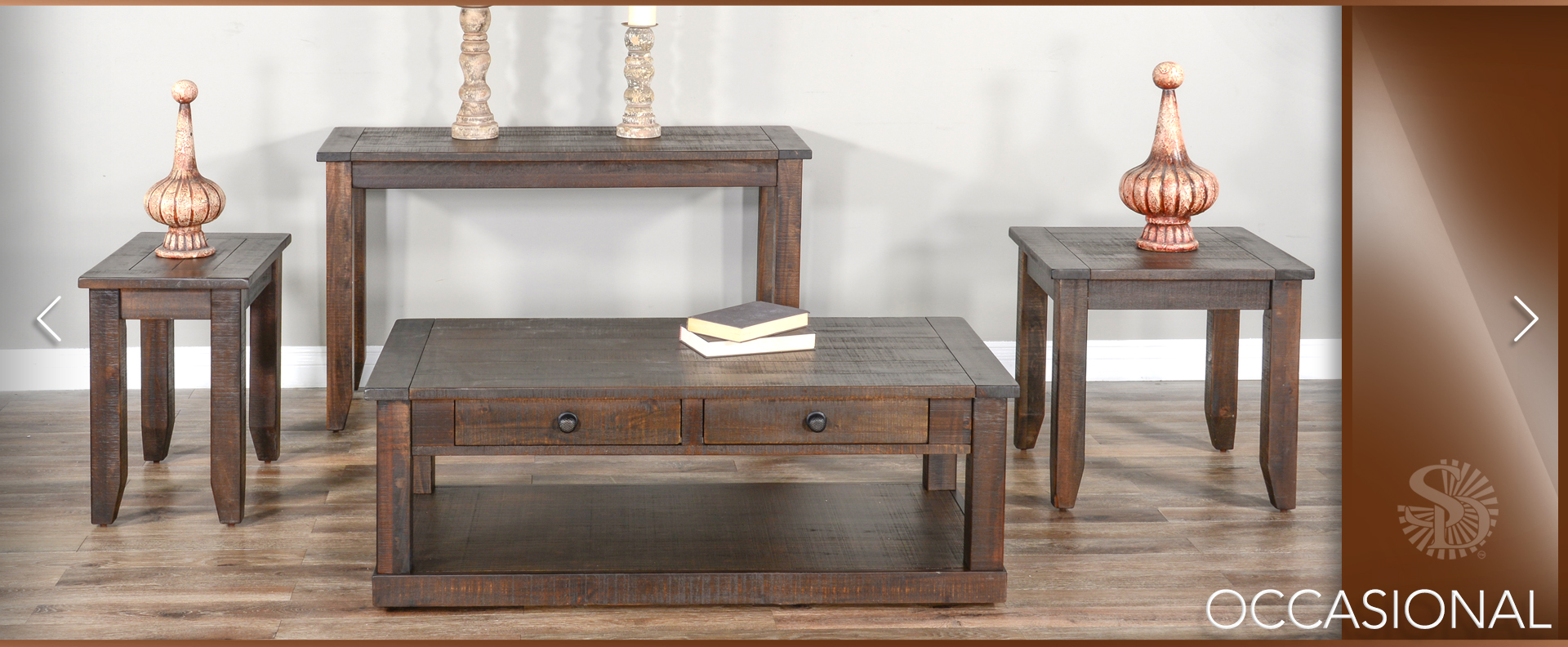 The Homestead occasional table set is robust and sturdily constructed with rough sawn mahogany solids and veneers. The coffee table features two drawers and hidden casters. All pieces have been completed with a plank top.