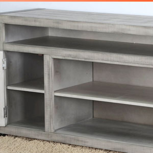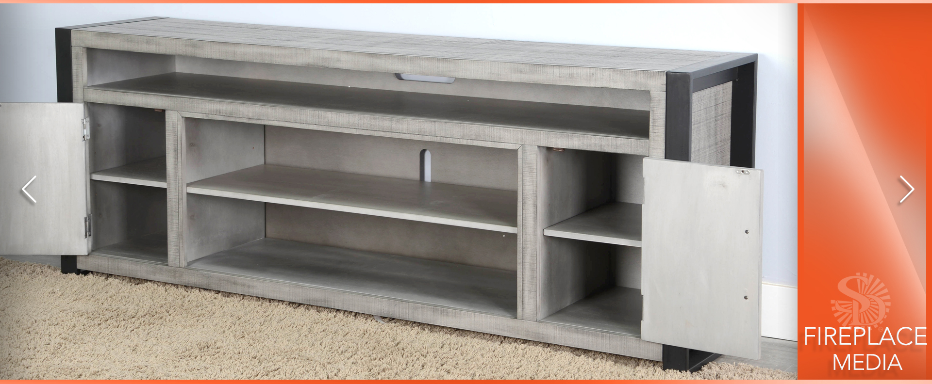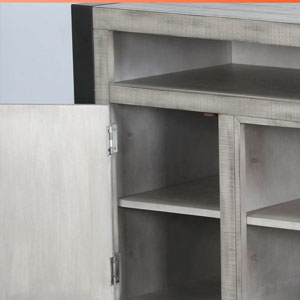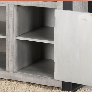 This entertainment wall is contemporary and full of features like adjustable shelves, cord management for electronics, and metal cross stretchers in the piers. In addition its constructed with mahogany solids and veneers and finished Alpine Grey.